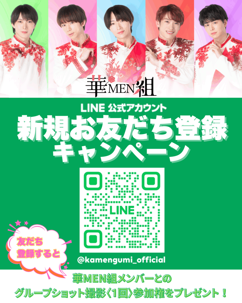 初めて華MEN組を知ってくださる方をはじめ、只今より、華MEN組LINE公式アカウントを新規で「お友だち」登録してくれた方全員に、