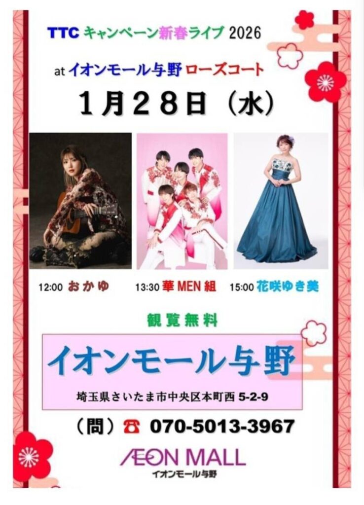 【特典内容変更!】2026年1月28日(水)TTCキャンペーンライブ2026 「イオンモール与野」華MEN組出演決定!