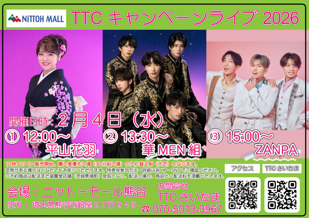 2026年2月4日(水)TTCキャンペーンライブ2026 「ニットーモール熊谷」華MEN組出演決定!